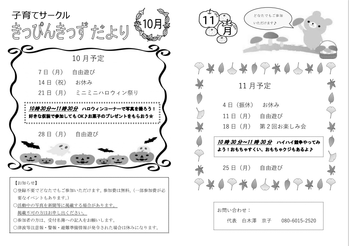 子育てサークルきっぴんきっずです。 11月11日(月)に予定しておりました、お楽しみ会は都合により11月18日(月)に変更いたします。 皆さんのご参加をお待ちしております♪ ※きっぴんきっずだよりを変更いたしました。