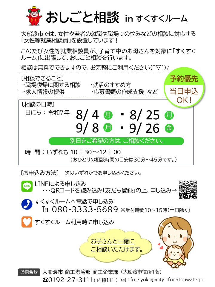 おしごと相談は、すくすくルームに大船渡市女性等就業相談員さんがいらしてくださり、復職のこと、再就職のことなどを広く相談できます。お子さんはスタッフが見守りますので、自分のペースで相談ができます。お気軽にお問い合わせください☺