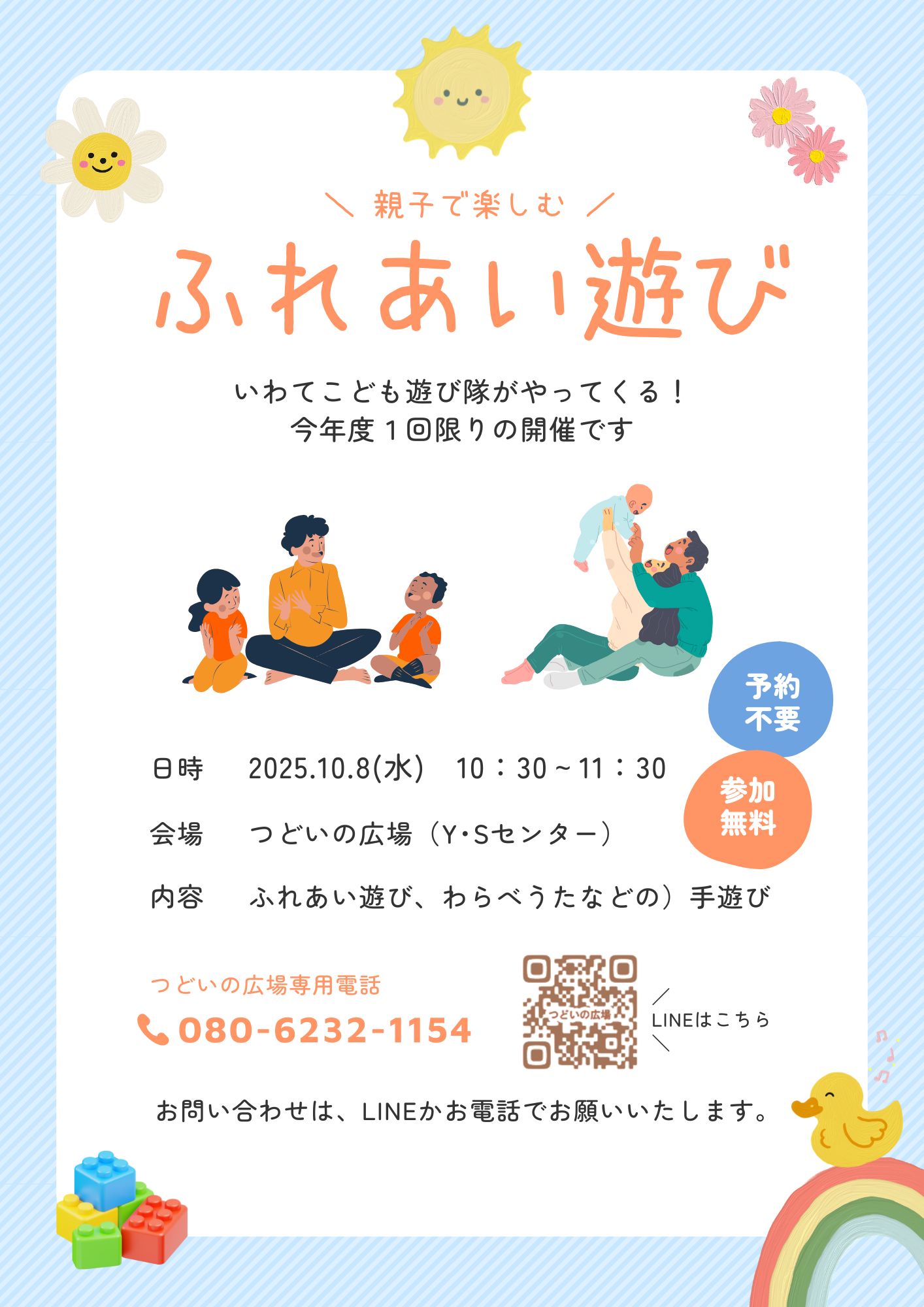 10月8日(水)、ふれあい遊びを開催します♪ 会場…Y・Sセンター つどいの広場 内容…ふれあい遊び、わらべうたなどの手遊び 予約は不要です! 皆さん是非遊びに来てくださいね~(^^)/ ※毎週水曜日は「おでかけひろば」の日ですが、8日は会場であるおおふなぽーとが利用不可であるため、おでかけひろばはお休みです。