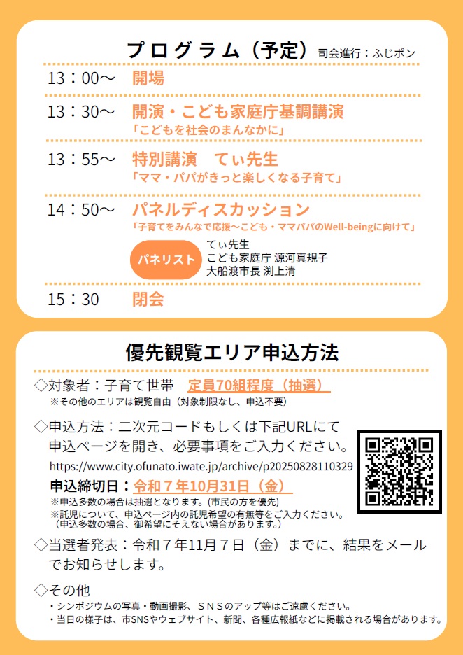 11月23日(日)、サン・リア1階のいこいの広場で、「こどもまんなかアクション」リレーシンポジウムinおおふなとを開催します。 当日は、こども家庭庁による基調講演のほか、テレビをはじめとした数多くのメディアに出演している「てぃ先生」による特別講演、パネルディスカッションを予定しています。また、司会進行は「ふじポン」が務めます。