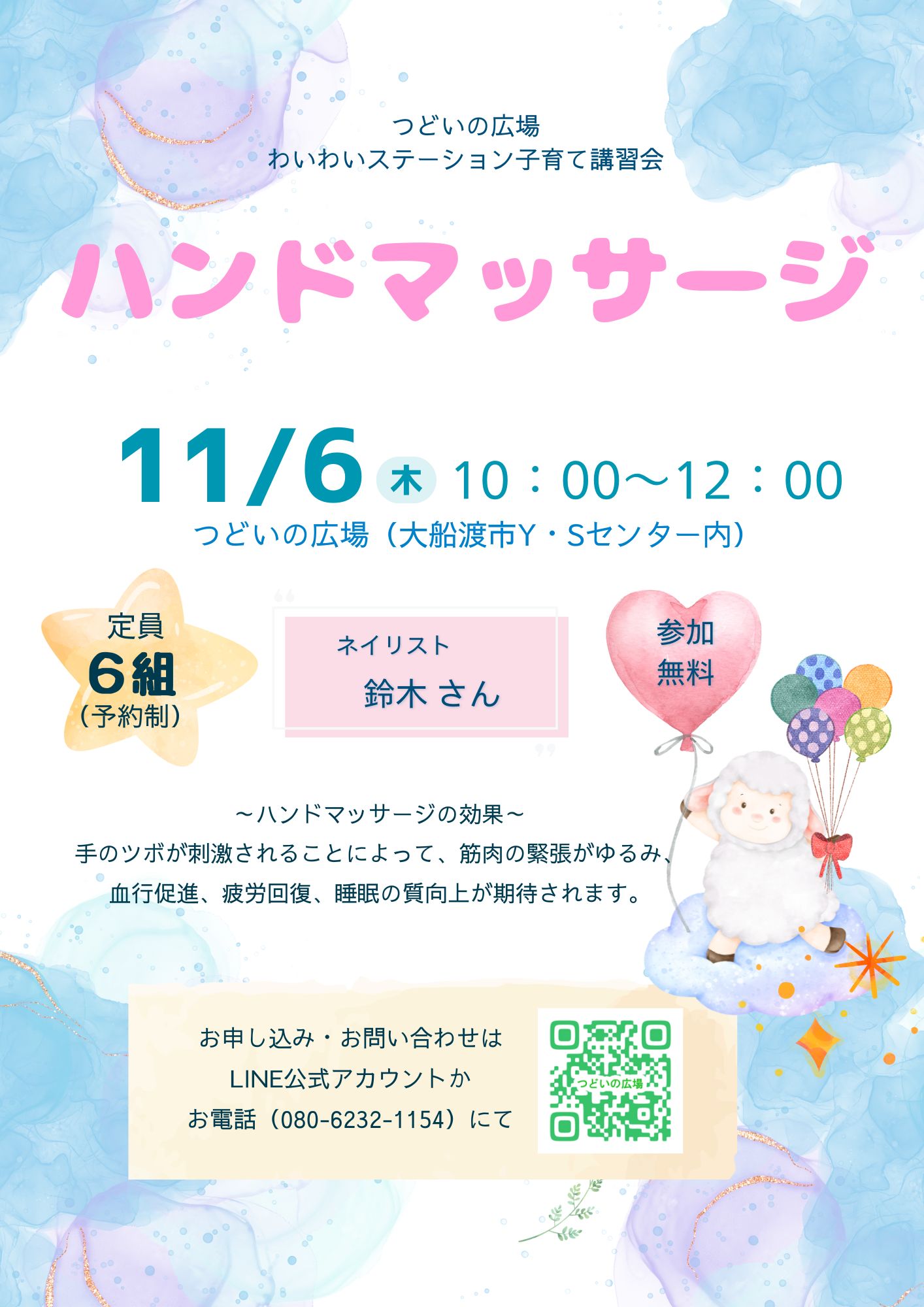 11月6日、つどいの広場でハンドマッサージがあります♪