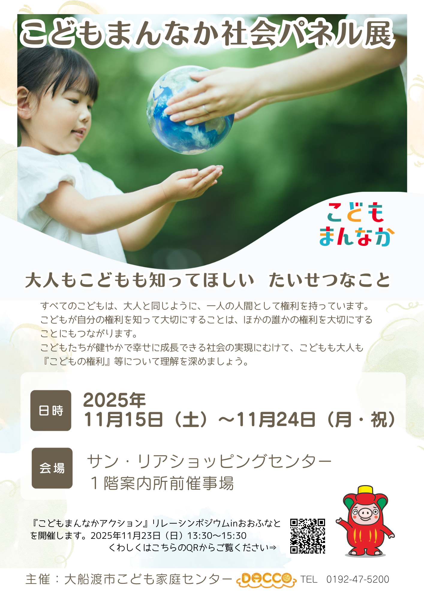 11月23日(日)に開催される「こどもまんなかアクション」リレーシンポジウムinおおふなとに合わせ、「こどもまんなか社会パネル展」を実施します。 「こどもの権利」等について理解を深め、こどもたちが健やかで幸せに成長できる社会を作りましょう。
