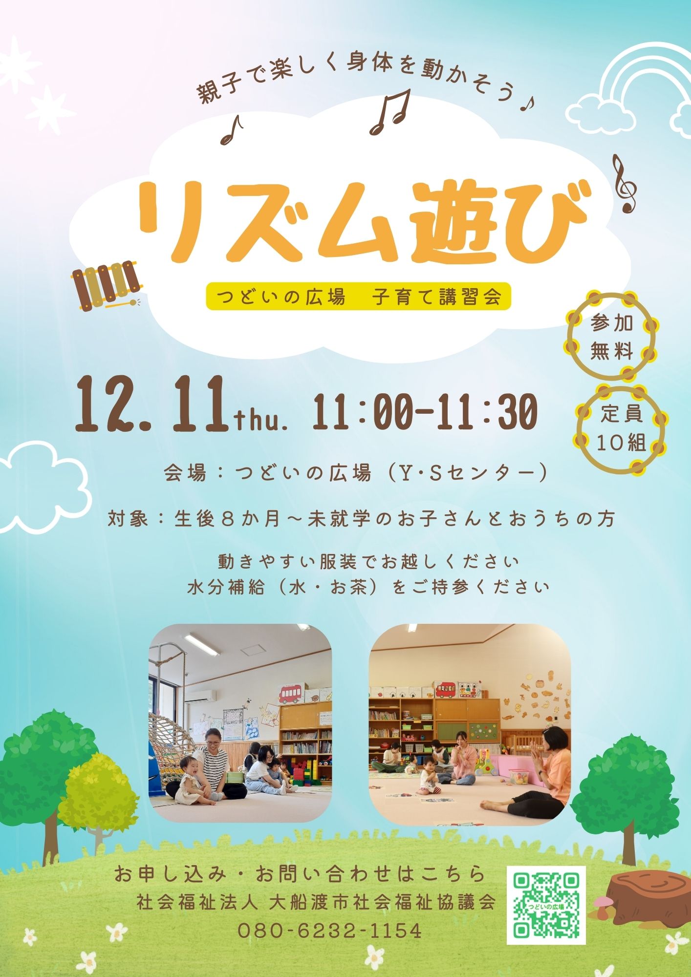 12月11日に、リズム遊びを開催します♬ 生後8か月~未就学のお子さんとおうちの方が対象です ※生後8か月未満のお子さんでも、(おうちの方の抱っこで)参加可能です 予約枠が10組となっておりますので、早めにお申し込みください(^^)/ ご予約はLINEかお電話にて☆