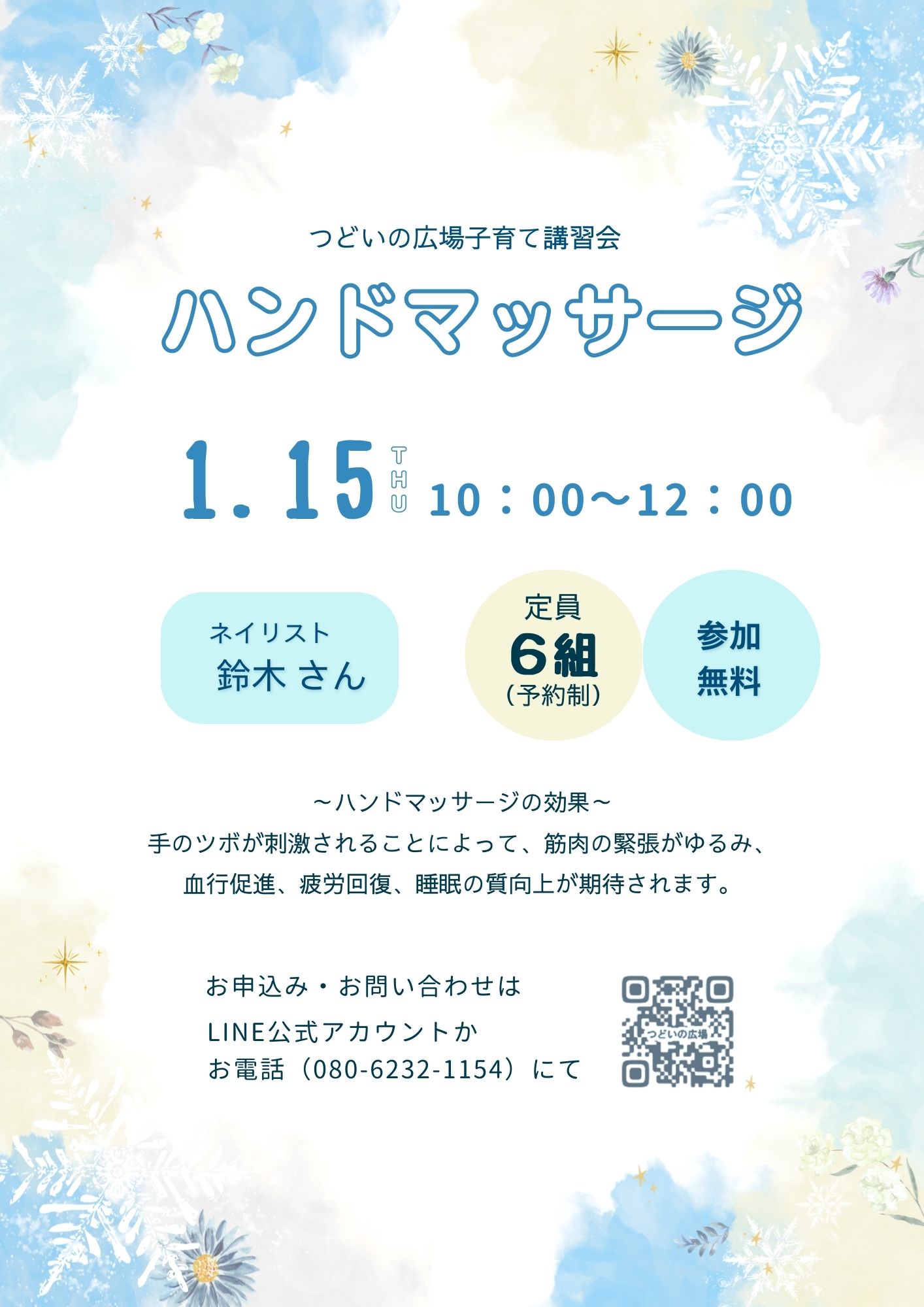 令和8年1月15日、つどいの広場でハンドマッサージがあります♪