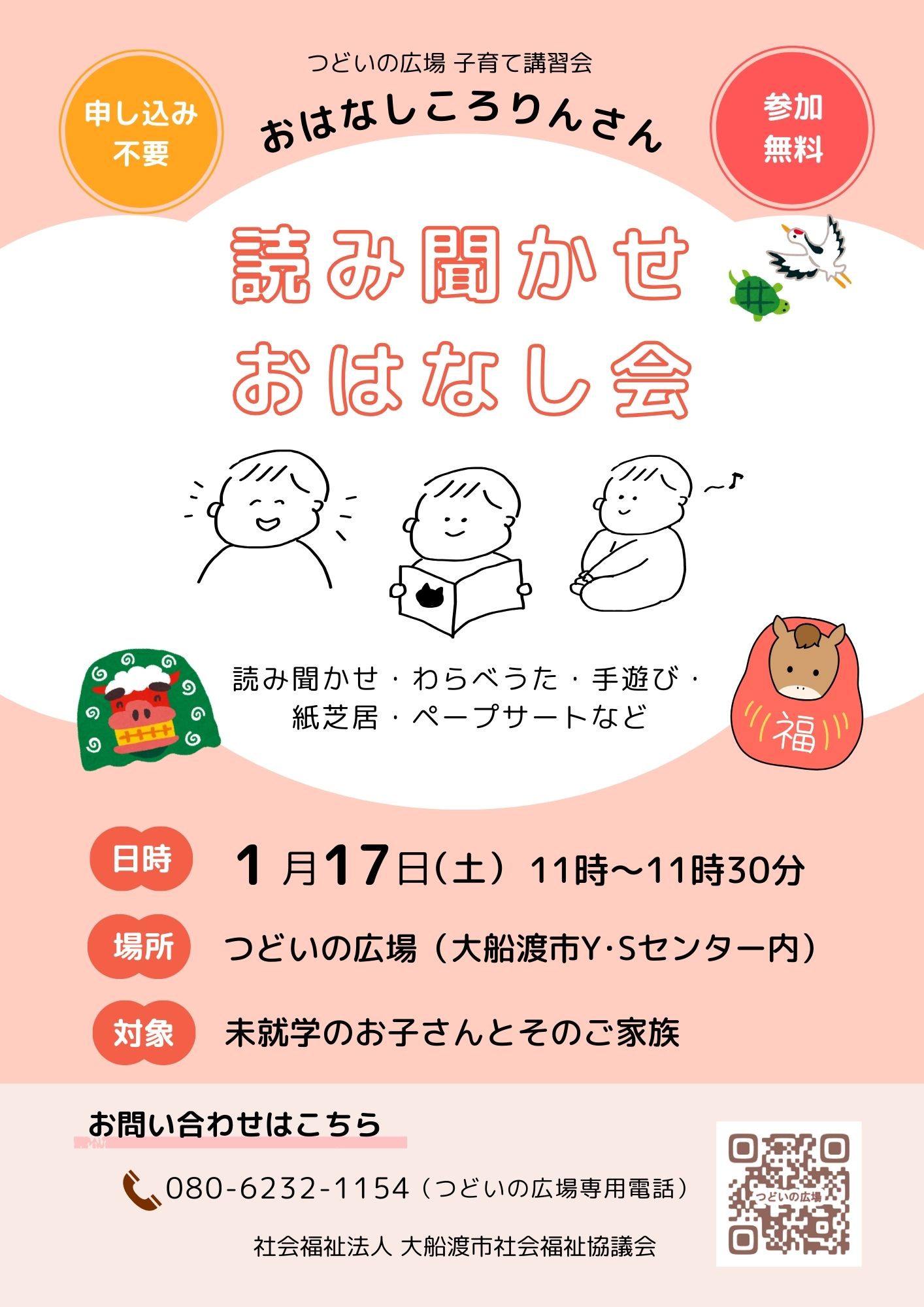 令和8年1月17日(土)、つどいの広場で『読み聞かせおはなし会』を開催します♪ おはなしころりんさんが、つどいの広場に来て読み聞かせをします☆ 遊び場なので、声を出しても遊んでも大丈夫です! 予約不要ですので、ふらっと遊びにきてくださいね(^^)/