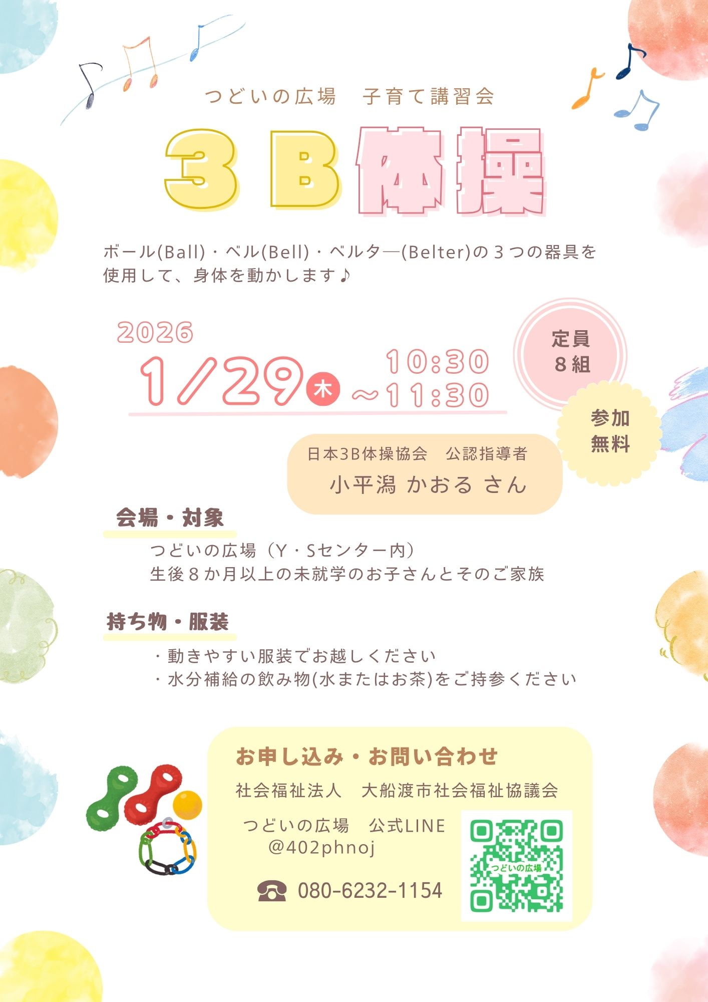 1月29日、「3B体操」を開催します♪ ボール、ベル、ベルターをを使いながら、楽しく身体を動かします! お子さんはもちろん、パパやママのストレッチにもなりますよ~ 今年度最後の開催となりますので、ご興味のある方、是非ご参加ください☆ ご予約・お問い合わせは、つどいの広場のLINEかお電話(080-6232-1154)にて☆