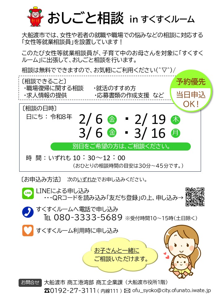 おしごと相談は、すくすくルームに大船渡市の女性等就業相談員さんがいらしてくださり、復職のこと、再就職のことなどを広く相談できます。