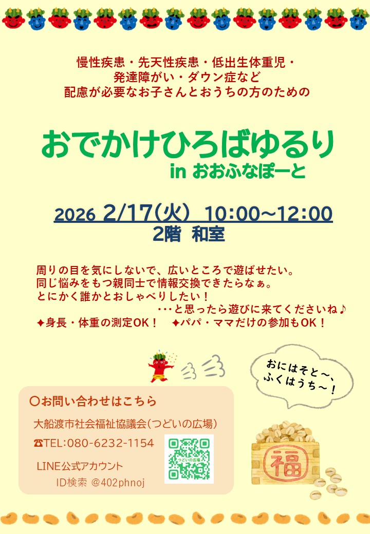 2月17日は「おでかけひろばゆるりinおおふなぽーと」の日です! つどいの広場がおおふなぽーとにおでかけします!! 2階のひろ~い和室で、ゆっくりまったりお子さんを遊ばせてみませんか? パパ、ママ、おじいちゃん、おばあちゃん、ご家族だけでのご利用もOKです。 お待ちしております★