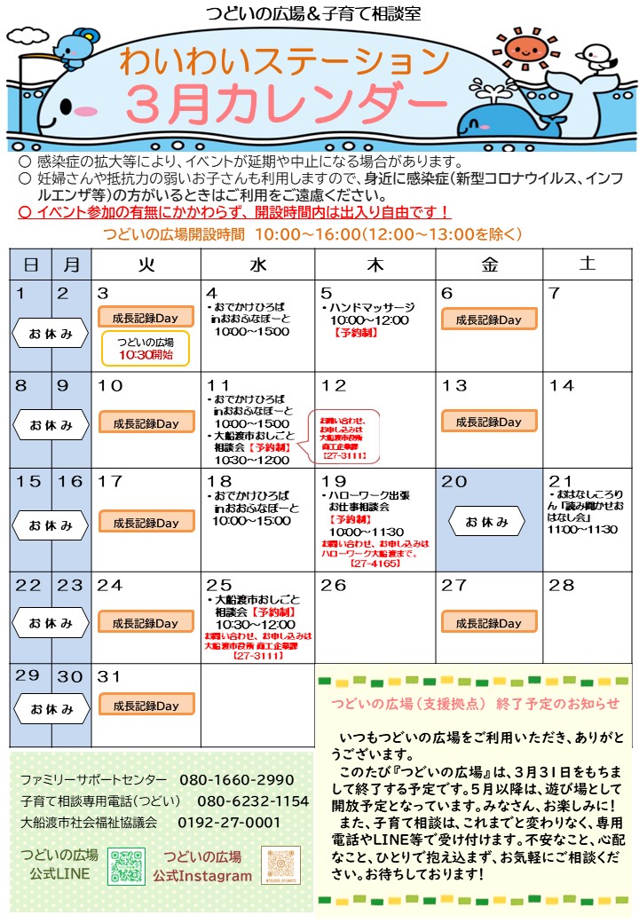 つどいの広場【3月カレンダー】をお届けします!!